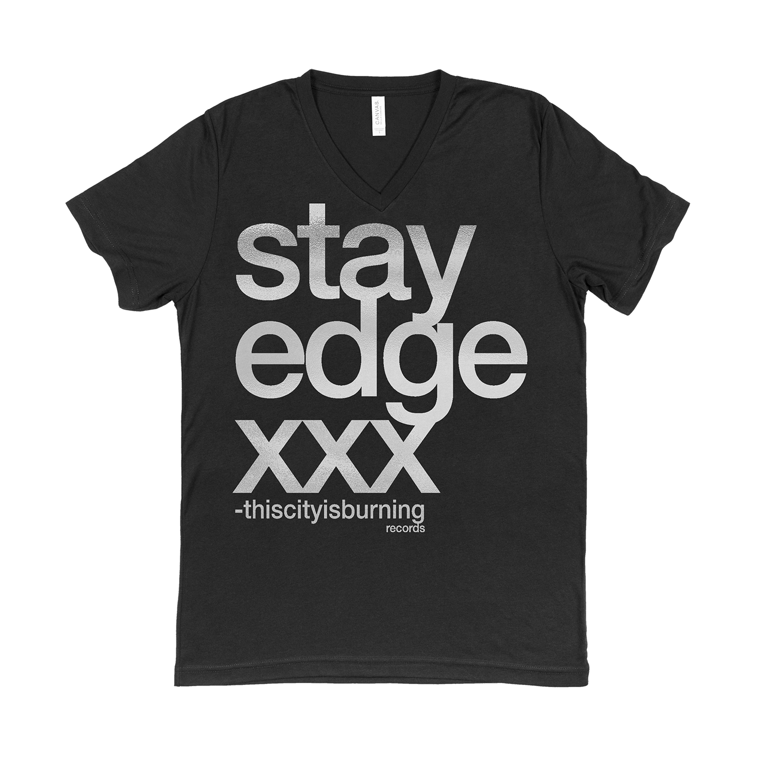silver foil print on black v-neck (bella/canvas most likely, comfort colors depending on availability)